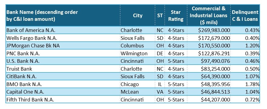 The 10 banks with the highest amount outstanding in C&I loans control 45% of the industry's C&I and are all rated at least 4-Stars by Bauer.