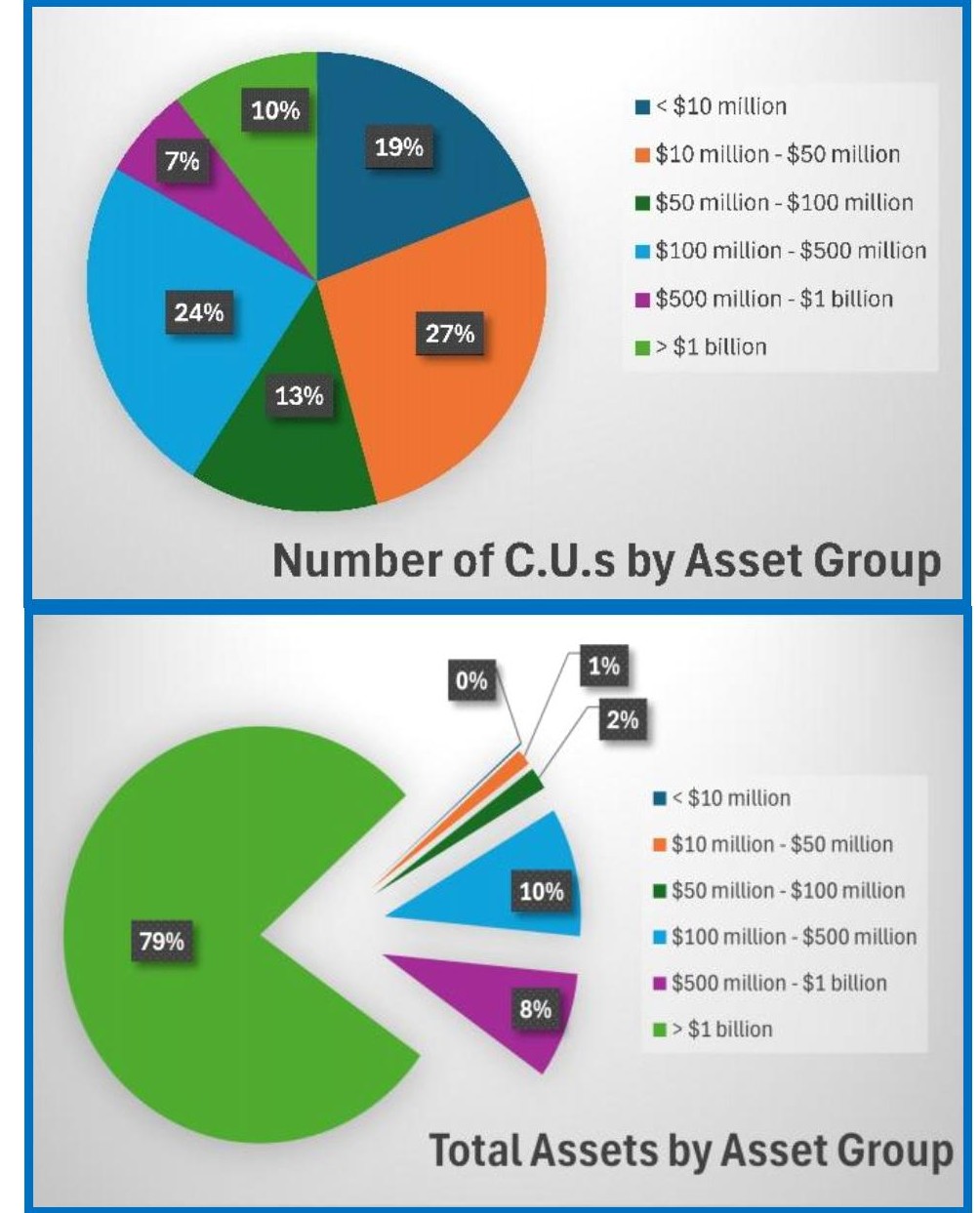 What we see in the diagrams below is that: a) the number of credit unions in each asset size category has not changed appreciably, the smallest account for 19% of the industry and the largest account for 10%, but b) the assets, particularly of the smallest three groupings have dwindled to less than 4% of the entire industry. The largest 10% of CU’s control 79% of industry assets.
