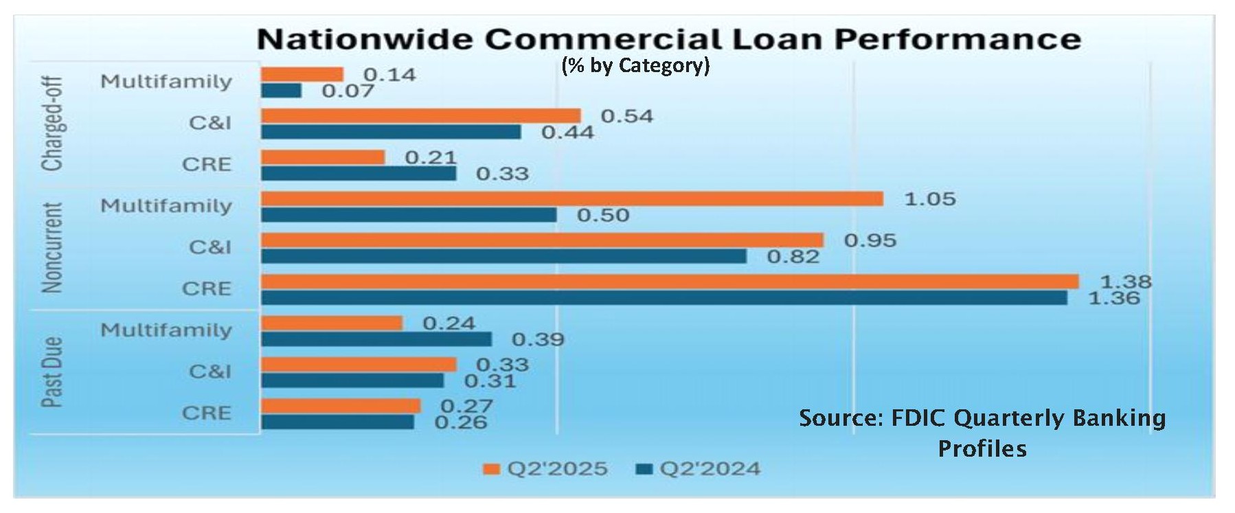 The biggest deterioration from June 2024 to June 2025 came in the form of underperforming multifamily (5 or more family real estate). The decline was greatest in the New York Region (which went from 0.94% noncurrent last June (2024) to 1.94% noncurrent this June). The Kansas City region jumped all the way from 0.29% to 1.23% over the year. These increases can be blamed largely on Mother Nature, but that doesn’t help matters.