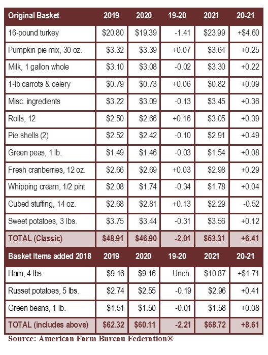 Turkey, the centerpiece of the meal, on the Farm Bureau survey was up 24%, more than double what the CPI indicated. Pie crusts had the second largest jump at 20%, followed by dinner rolls and vegetables. The only item that cost less this year was cubed stuffing mix. That was down 19% from last year.